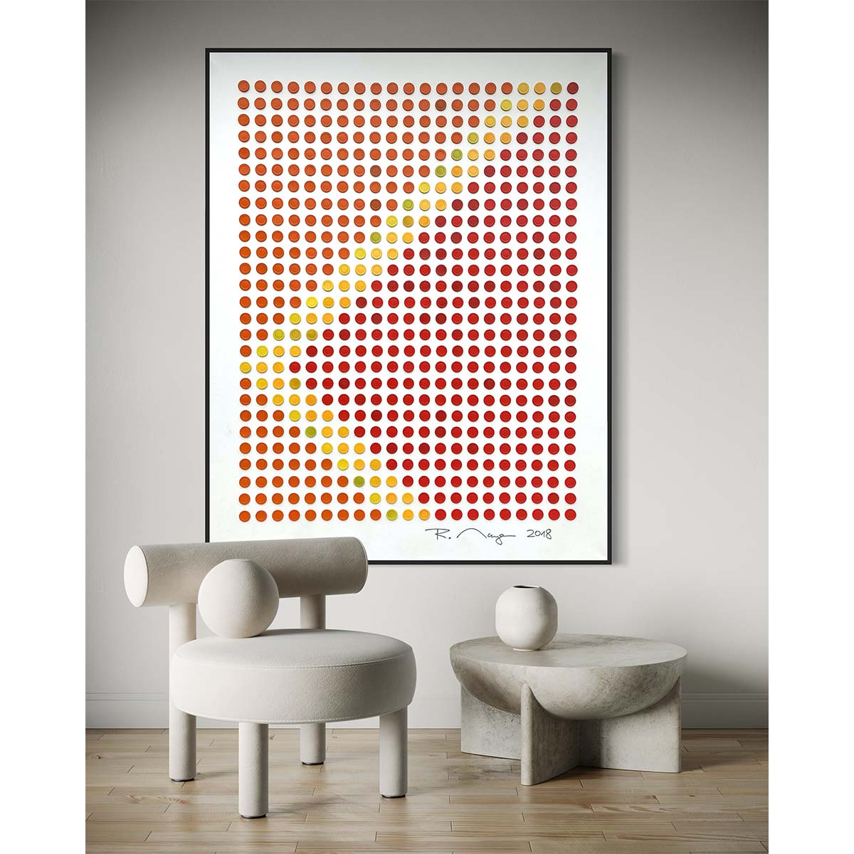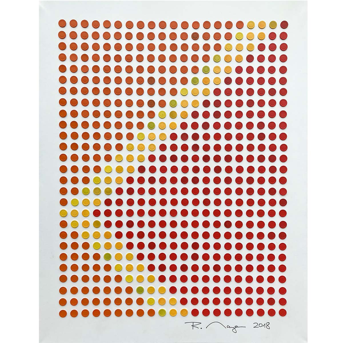 René Mayer, 2018, H x W: 180 x 140 cm. Acrylic and painted casino chips on canvas.